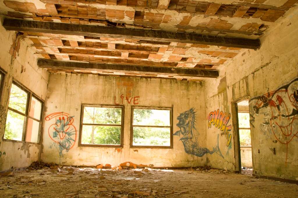 La nature a repris ses droits, peignant d'un fard vert et brun l'oeil-volet d'une maison borgne abandonnée.