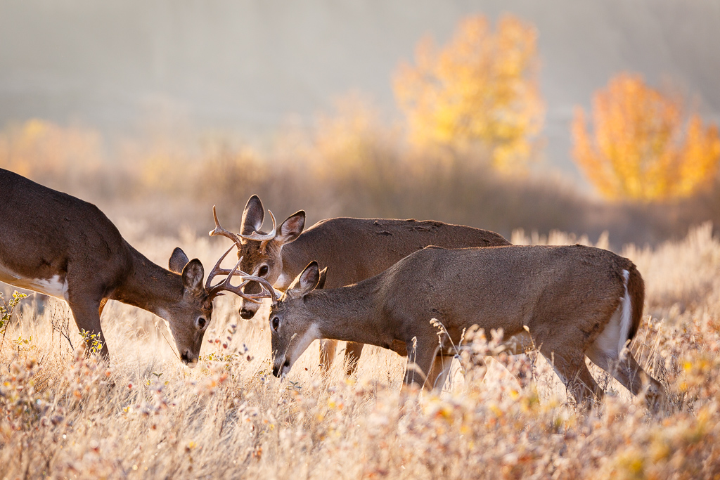 Ces 3 jeunes mâles "Cerf de Virginie" (white-tailed deer pour les locaux, ou chevreuils pour nos amis québecois) ne semblent pas faire partie des mâles dominants, et jouaient à se défier en préparation pour les prochaines années où ils vont devoir défendre leur droit à se reproduire. Jeux à 2 souvent, jeux à 3 parfois, j'ai pu profiter de ce spectacle un long moment !