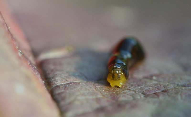 Comme tu dis, "beurk", parceque l'aspect de cette larve de "Caliroa limacia", hyménoptère symphyte n'est pas très engageant je te le concède. Elle mesure 5 à 6mm de longueur, souvent appelée fausse-chenille elle dévore le limbe des feuilles dont il ne reste plus que les nervures. A l'oeil nu on aperçoit une sorte de magma noir mou au toucher et c'est la macrophoto qui révèle les détails de cette drôle de"bestiole".
