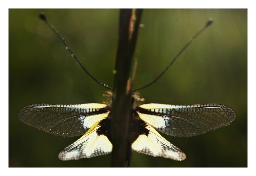 Le soleil était apparue derrière les arbres depuis quelques minutes, quelques minutes encore et cette ascalaphe décollait.