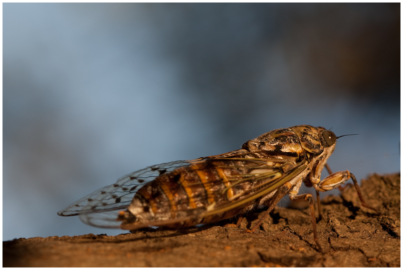 Une cigale au coucher de soleil. Je l'ai prise verticale mais j''ai tenté une rotation. Je ne sais pas si ça colle... Verticalement je la trouve "bizarre" bien que cela soit son positionnement naturel lors de la prise.
