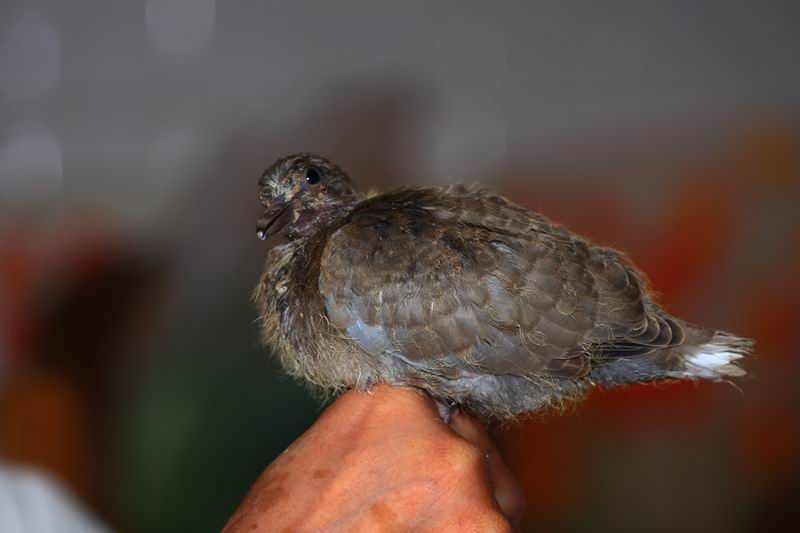 Petite tourterelle tombée du nid voici + d'une semaine et recueuillie dans un état.... ; nourrie avec patience d'ange par ma femme et voici donc mademoiselle qui a doublé de volume et fait ses plumes.