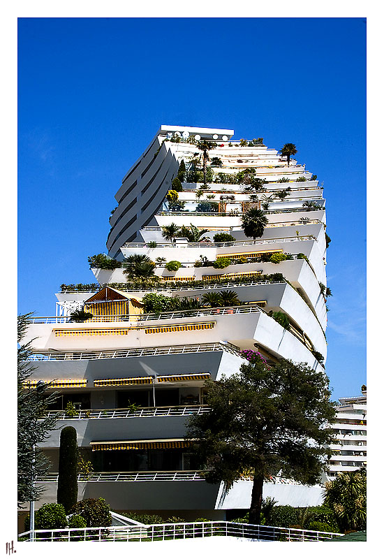 Cette pièce urbaine unique, implantée entre Antibes et Nice, souleva une violente polémique due à son gigantisme et à son effet de barrière visuelle en bord de mer. OEuvre au design d’un effet plastique indéniable, l’ensemble de l’édifice en gradins s’enroulant sur lui-même, tel une formidable escadrille de voiliers, est le résultat d’une lente maturation défiant les normes de la réglementation.