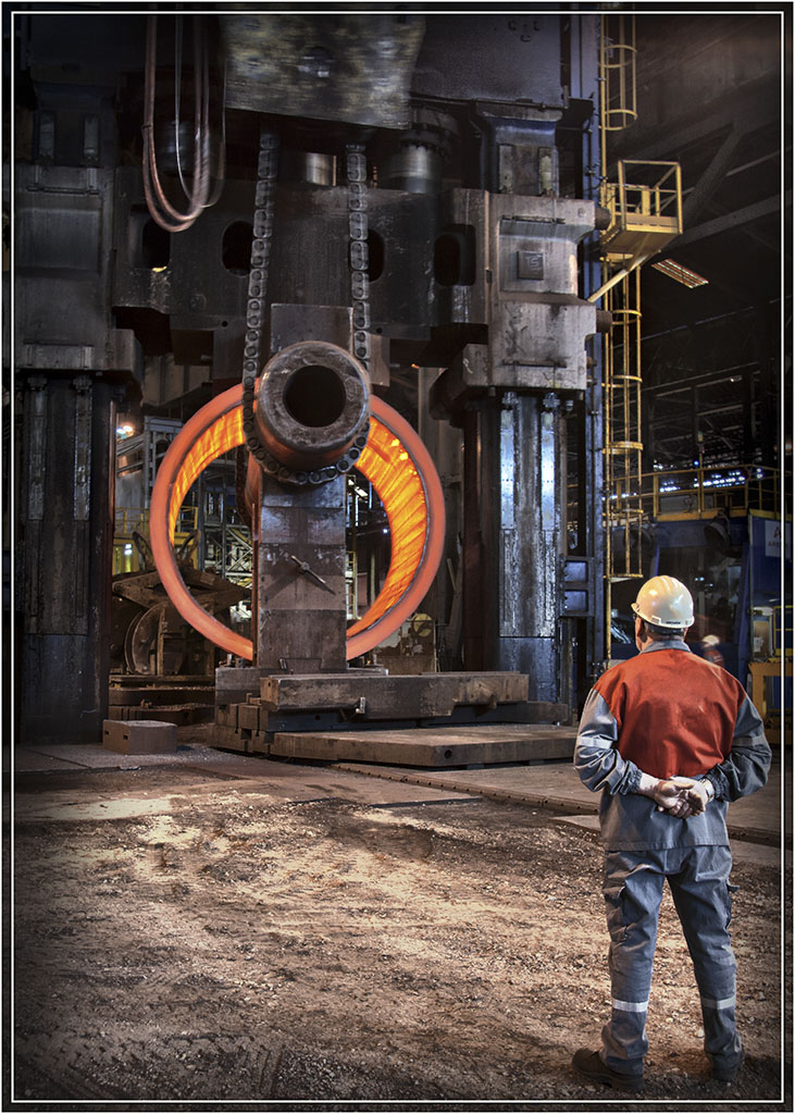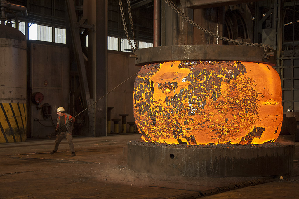 Lingot de forge en acier pour cuve de centrale. Les pièces sont forgées à chaud sous une presse de 11000 Tonnes.