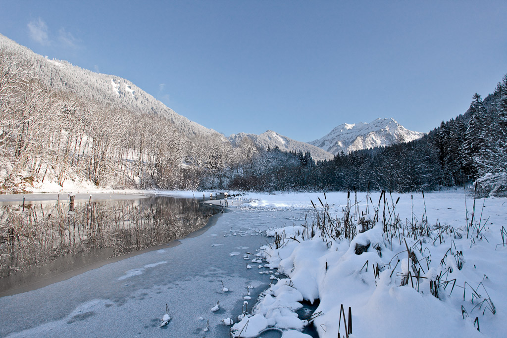 J'en ai une autre, en me rapprochant de la berge (en fait en profitant des zones gelées...) qui détache un peu plus le massif, j'ai essayé d'avoir les 2, mais en position très inconfortable, mon angle de PDV n'était pas terrible... du coup ci-dessous je la propose en n°3, mais en recadrage 16:9 pour essayer de conserver au maximum la zone non gelée et le reflet.