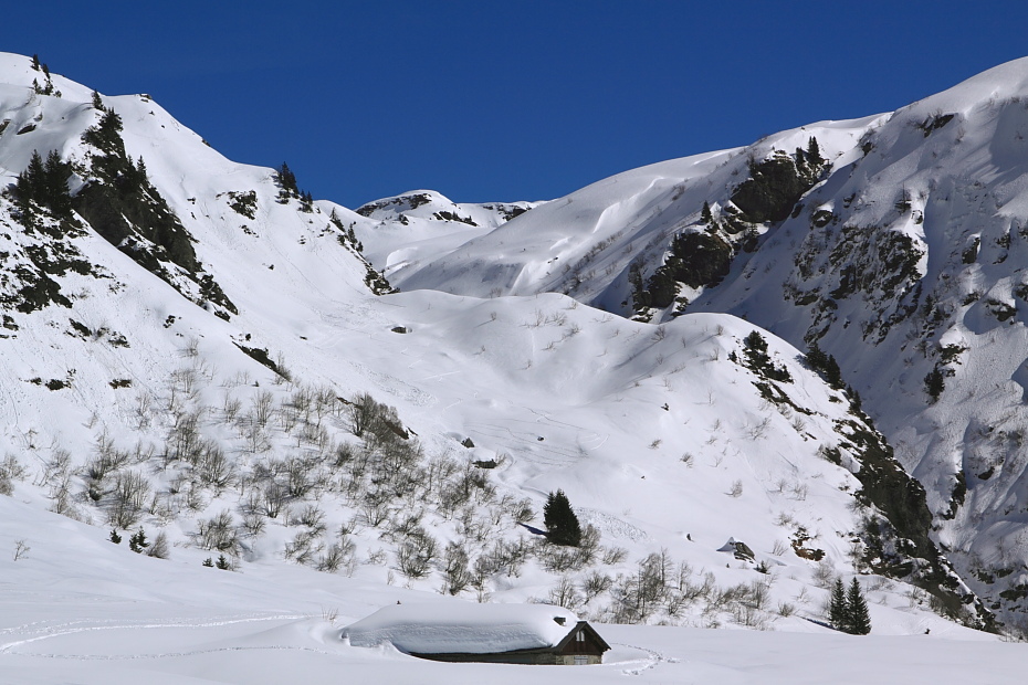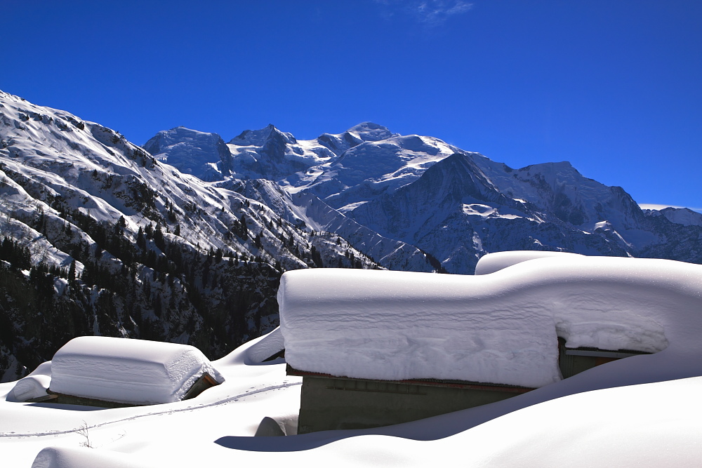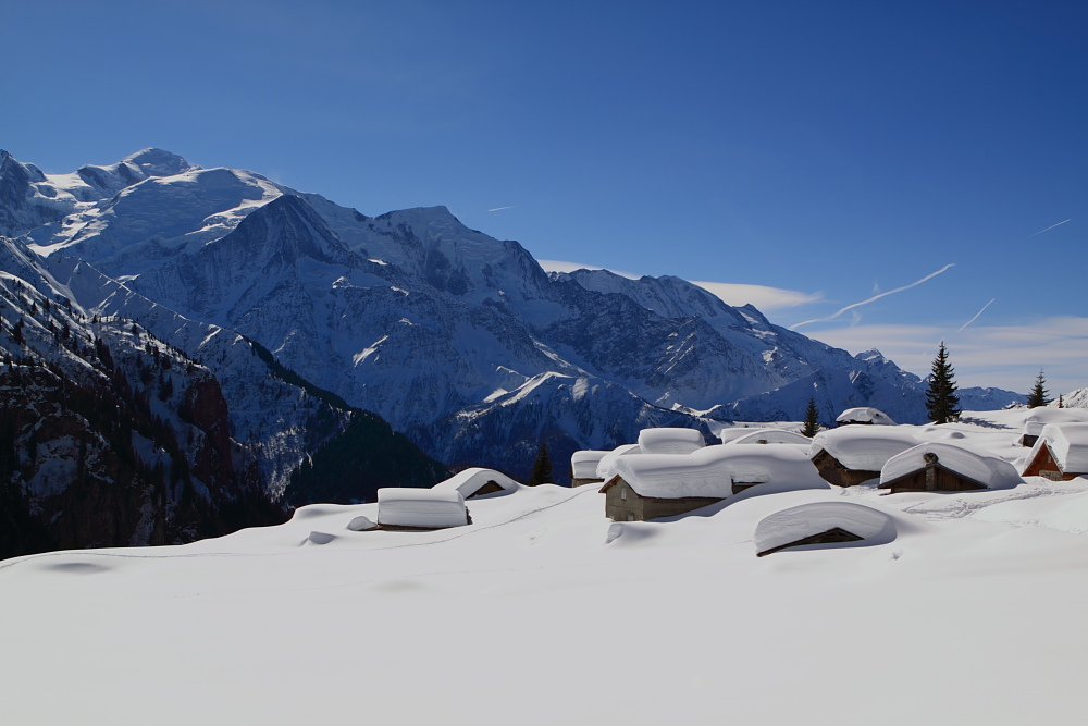 Apres une 1h30 de rando en raquettes, on est tombé sur ce village abandonné l' hiver ( pour cause trop de neige ) face au mont blanc