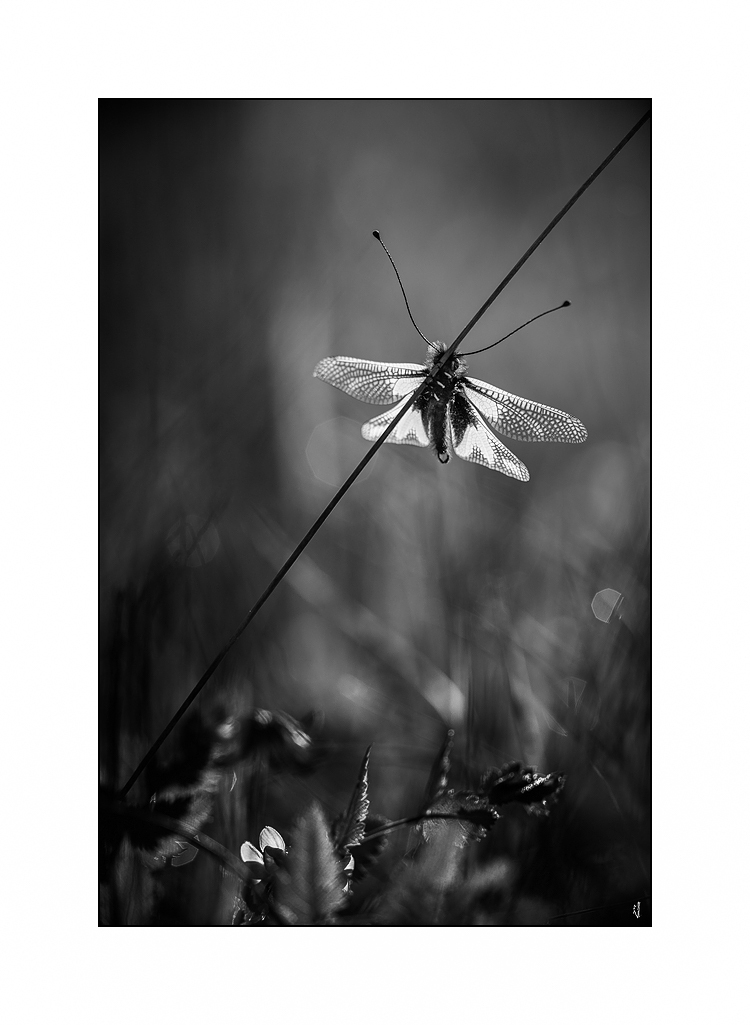 Une très belle présentation de cet ascalaphe et le N&B lui va bien.