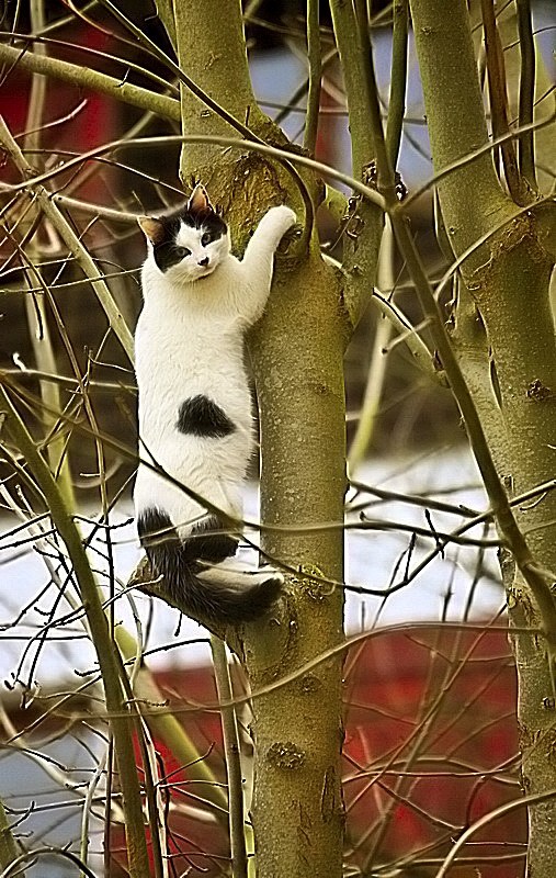 Pris sur le vif au détour d'une route voici un petit chat sur perché un arbre.